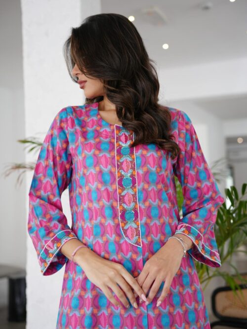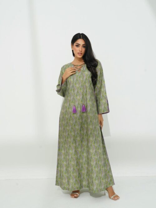 A luxurious cotton Jalabiya with elegant beadwork along the neckline and chest. Perfect for any occasion.